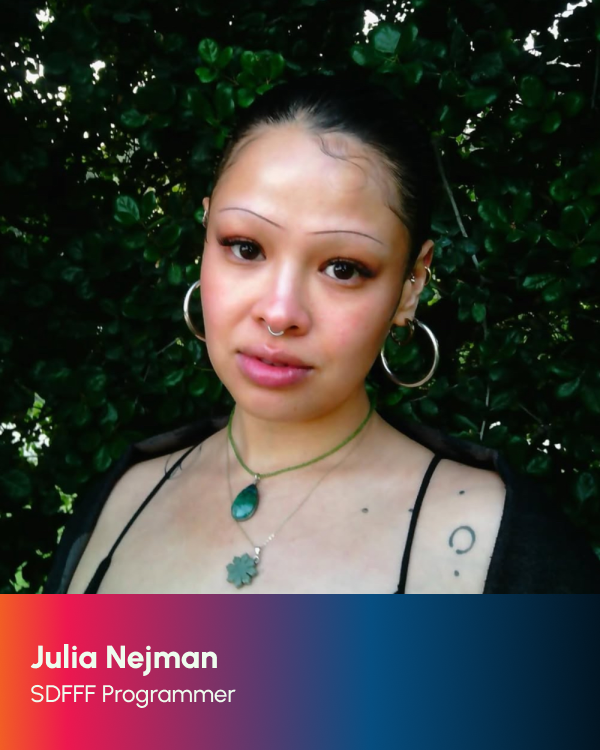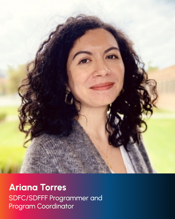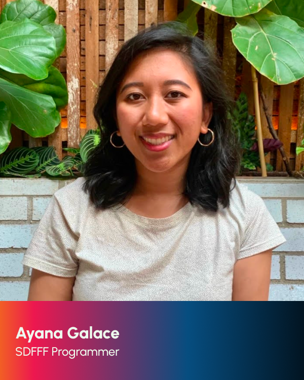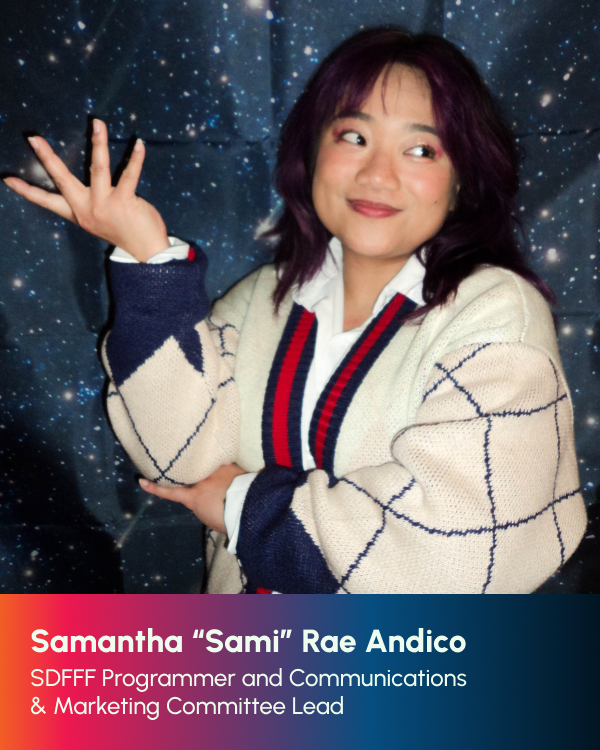 It has been an absolute joy and honor to be part of SDFC’s programming team again this year. SDFC cultivates a nurturing environment and community for creators, artists, and visionaries alike to grow in their craft and share their unique stories. As a member of the programming team, watching each project submitted reminded me of the power of storytelling through filmmaking. With a diverse display of identities, experiences, and stories expressed through varying formats and styles, the film lineup for this year is not one to be missed. I always leave this experience feeling inspired, grounded, and curious, eager for audiences to experience their own journey through each film.